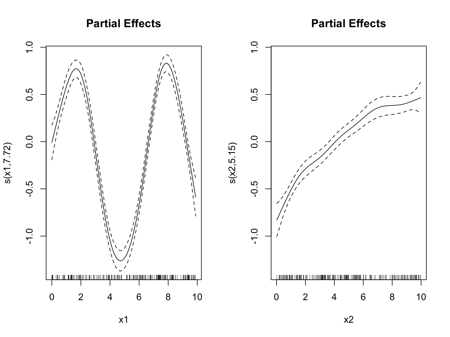 Fit a GAM with smooth terms for \(x_1\) and \(x_2\) (ignoring the interaction). Does the model capture the main effects?