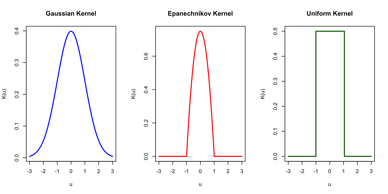 u <-seq(-3, 3, length.out =100)par(mfrow =c(1, 3))# Gaussianplot(u, dnorm(u), type ="l", lwd =2, col ="blue",main ="Gaussian Kernel", xlab ="u", ylab ="K(u)")# Epanechnikovepan <-ifelse(abs(u) <=1, 0.75* (1- u^2), 0)plot(u, epan, type ="l", lwd =2, col ="red",main ="Epanechnikov Kernel", xlab ="u", ylab ="K(u)")# Uniformunif <-ifelse(abs(u) <=1, 0.5, 0)plot(u, unif, type ="s", lwd =2, col ="darkgreen",main ="Uniform Kernel", xlab ="u", ylab ="K(u)")