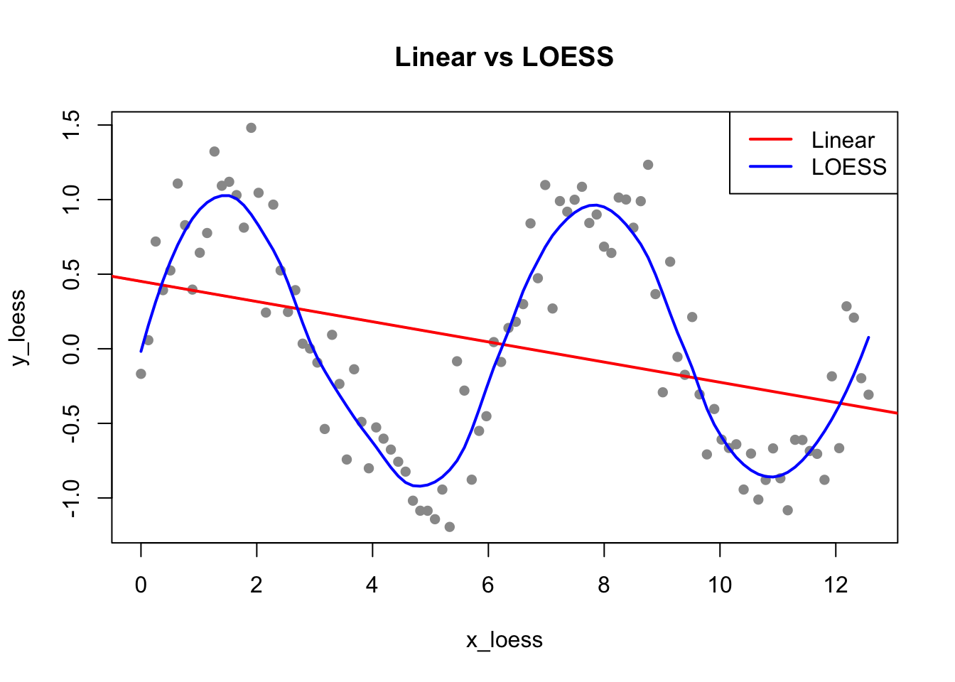 # Generate sinusoidal dataset.seed(123)x_loess <-seq(0, 4*pi, length.out =100)y_loess <-sin(x_loess) +rnorm(100, sd =0.3)plot(x_loess, y_loess, pch =16, col ="gray60", main ="Linear vs LOESS")abline(lm(y_loess ~ x_loess), col ="red", lwd =2)lines(x_loess, predict(loess(y_loess ~ x_loess, span =0.3)), col ="blue", lwd =2)legend("topright", c("Linear", "LOESS"), col =c("red", "blue"), lwd =2)