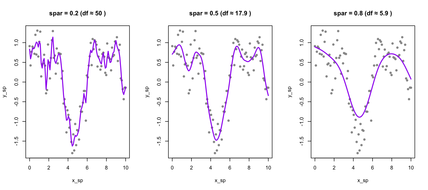 par(mfrow =c(1, 3))for (sp inc(0.2, 0.5, 0.8)) { loess_fit <-loess(y_loess ~ x_loess, span = sp)plot(x_loess, y_loess, pch =16, col ="gray60", main =paste("Span =", sp))lines(x_loess, predict(loess_fit), col ="blue", lwd =2)lines(x_loess, sin(x_loess), col ="red", lwd =2, lty =2)}