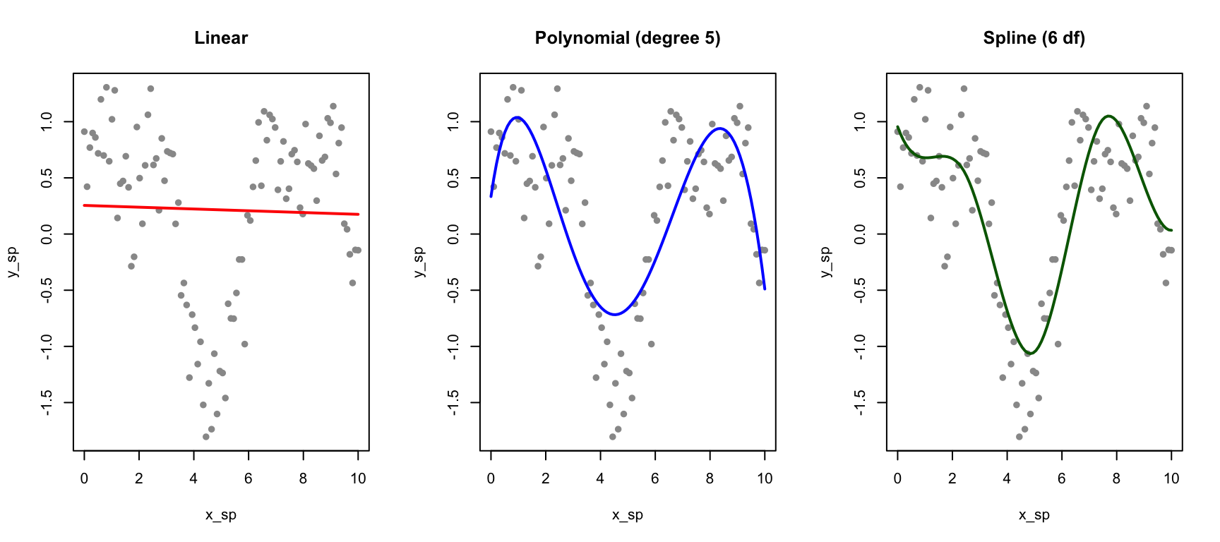# Generate non-linear dataset.seed(42)x_sp <-seq(0, 10, length.out =100)y_sp <-sin(x_sp) +0.5*cos(2*x_sp) +rnorm(100, sd =0.3)data_sp <-data.frame(x = x_sp, y = y_sp)# Fit different modelsfit_linear <-lm(y ~ x, data = data_sp)fit_poly <-lm(y ~poly(x, 5), data = data_sp)fit_spline <-lm(y ~bs(x, df =6), data = data_sp) # B-spline with 6 df# Predictionsdata_sp$pred_linear <-predict(fit_linear)data_sp$pred_poly <-predict(fit_poly)data_sp$pred_spline <-predict(fit_spline)par(mfrow =c(1, 3))plot(x_sp, y_sp, pch =16, col ="gray60", main ="Linear")lines(x_sp, data_sp$pred_linear, col ="red", lwd =2)plot(x_sp, y_sp, pch =16, col ="gray60", main ="Polynomial (degree 5)")lines(x_sp, data_sp$pred_poly, col ="blue", lwd =2)plot(x_sp, y_sp, pch =16, col ="gray60", main ="Spline (6 df)")lines(x_sp, data_sp$pred_spline, col ="darkgreen", lwd =2)