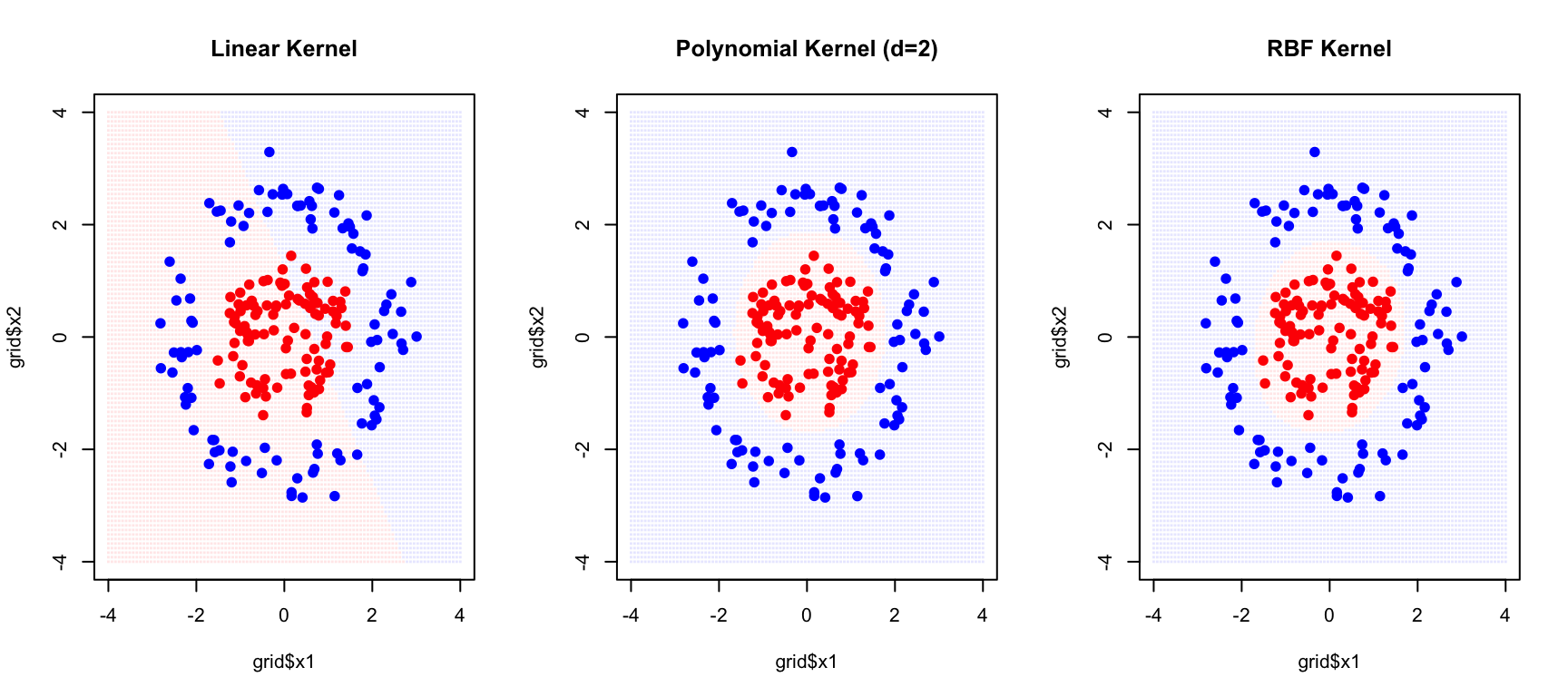 A linear SVM fails on this data. But if we map to a higher-dimensional space using features like \(x_1^2\), \(x_2^2\), \(x_1 x_2\), the classes might become linearly separable.