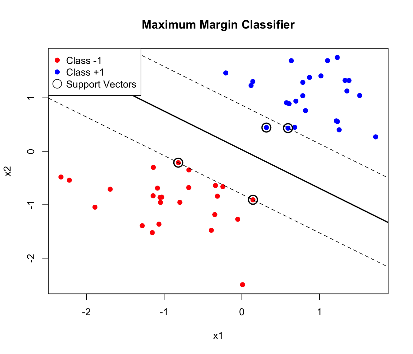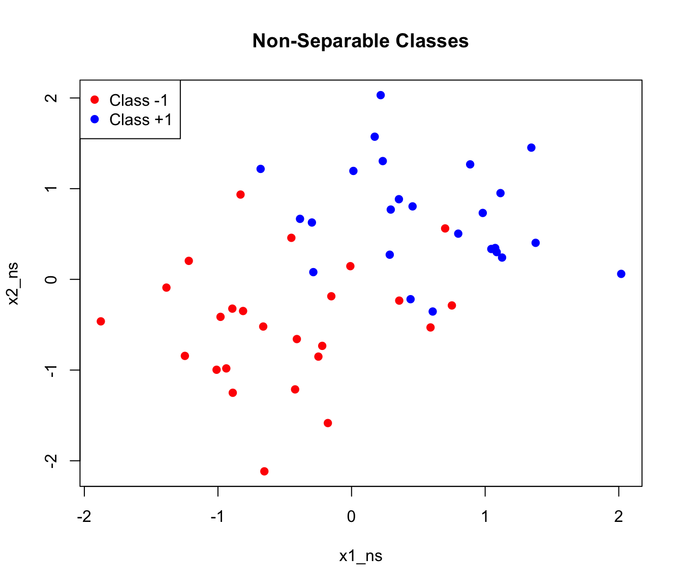 legend("topleft", c("Class -1", "Class +1"), col = c("red", "blue"), pch = 19)