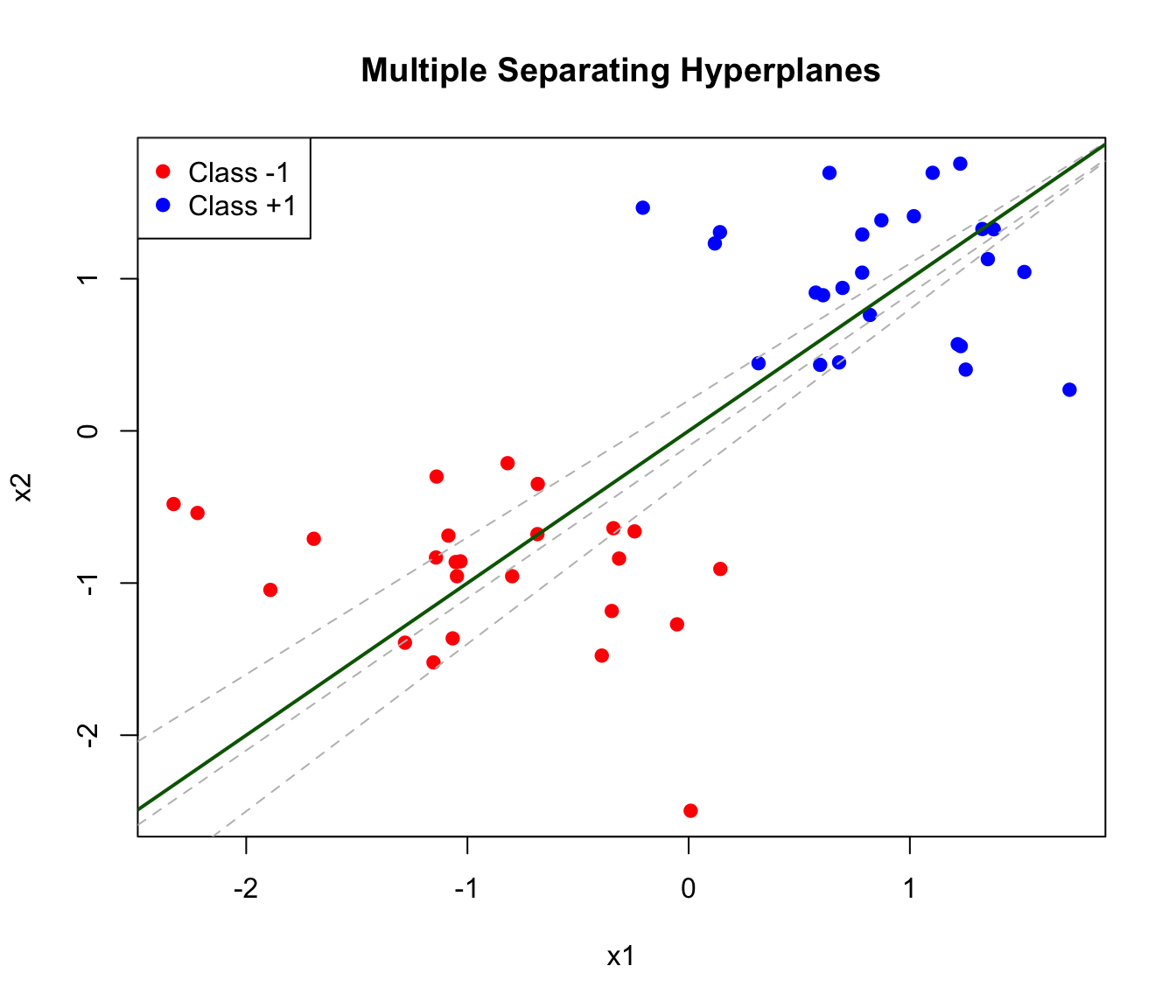 Consider a simple two-class classification problem with two features. If the classes are linearly separable—they can be perfectly separated by a straight line (or hyperplane in higher dimensions)—there are infinitely many possible separating lines.