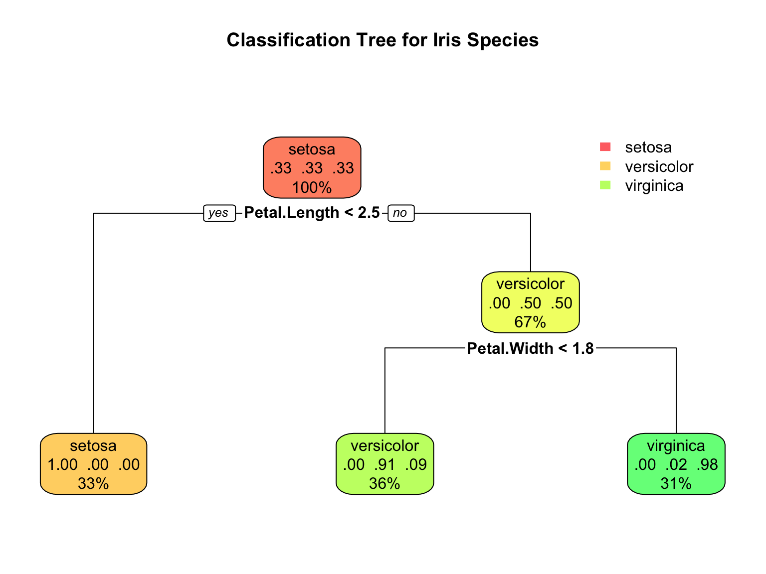 Petal.Length < 2.45 to the left, improve=50.00000, (0 missing)
