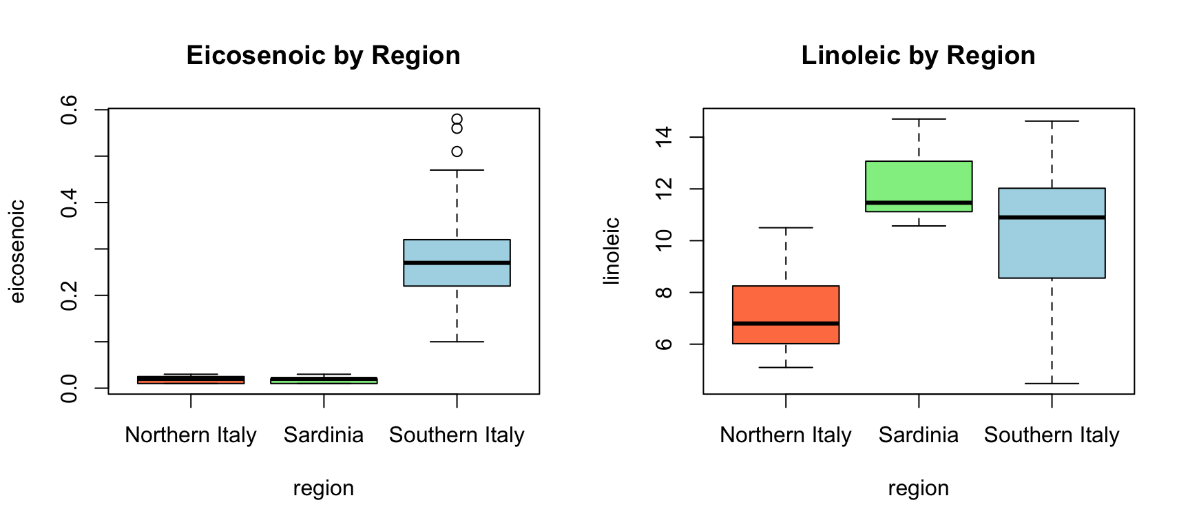 olive <-select(olive, -area)par(mfrow =c(1, 2))boxplot(eicosenoic ~ region, data = olive, col =c("coral", "lightgreen", "lightblue"),main ="Eicosenoic by Region")boxplot(linoleic ~ region, data = olive, col =c("coral", "lightgreen", "lightblue"),main ="Linoleic by Region")