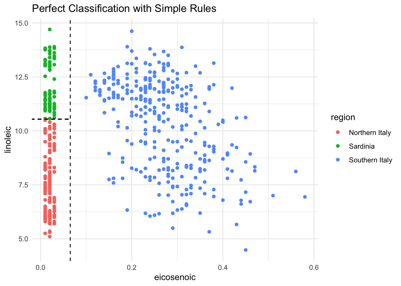 olive %>%ggplot(aes(eicosenoic, linoleic, color = region)) +geom_point() +geom_vline(xintercept =0.065, lty =2) +geom_segment(x =-0.2, y =10.54, xend =0.065, yend =10.54,color ="black", lty =2) +labs(title ="Perfect Classification with Simple Rules")