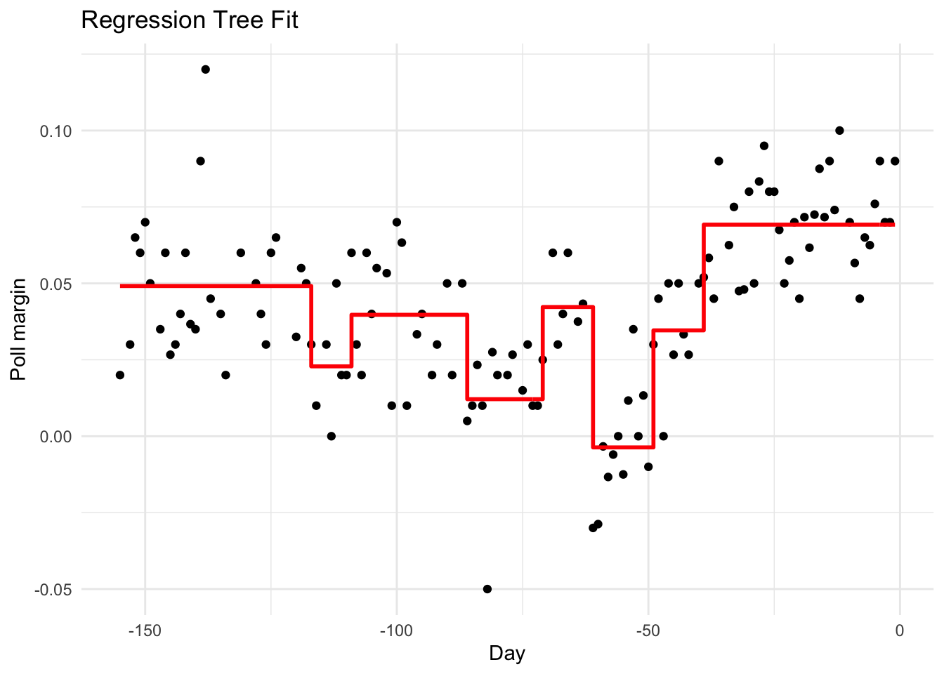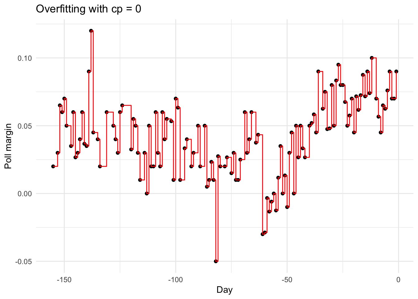 fit_overfit <-rpart(margin ~ ., data = polls_2008,control =rpart.control(cp =0, minsplit =2))polls_2008 %>%mutate(y_hat =predict(fit_overfit)) %>%ggplot() +geom_point(aes(day, margin)) +geom_step(aes(day, y_hat), col ="red") +labs(title ="Overfitting with cp = 0", x ="Day", y ="Poll margin")