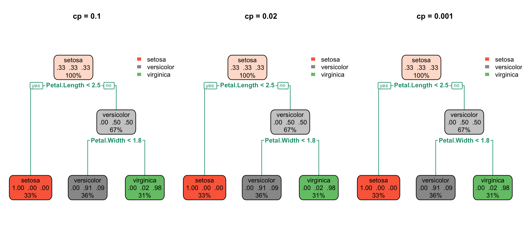 par(mfrow =c(1, 3))for (cp_val inc(0.1, 0.02, 0.001)) { tree <-rpart(Species ~ ., data = iris, cp = cp_val)rpart.plot(tree, main =paste("cp =", cp_val))}