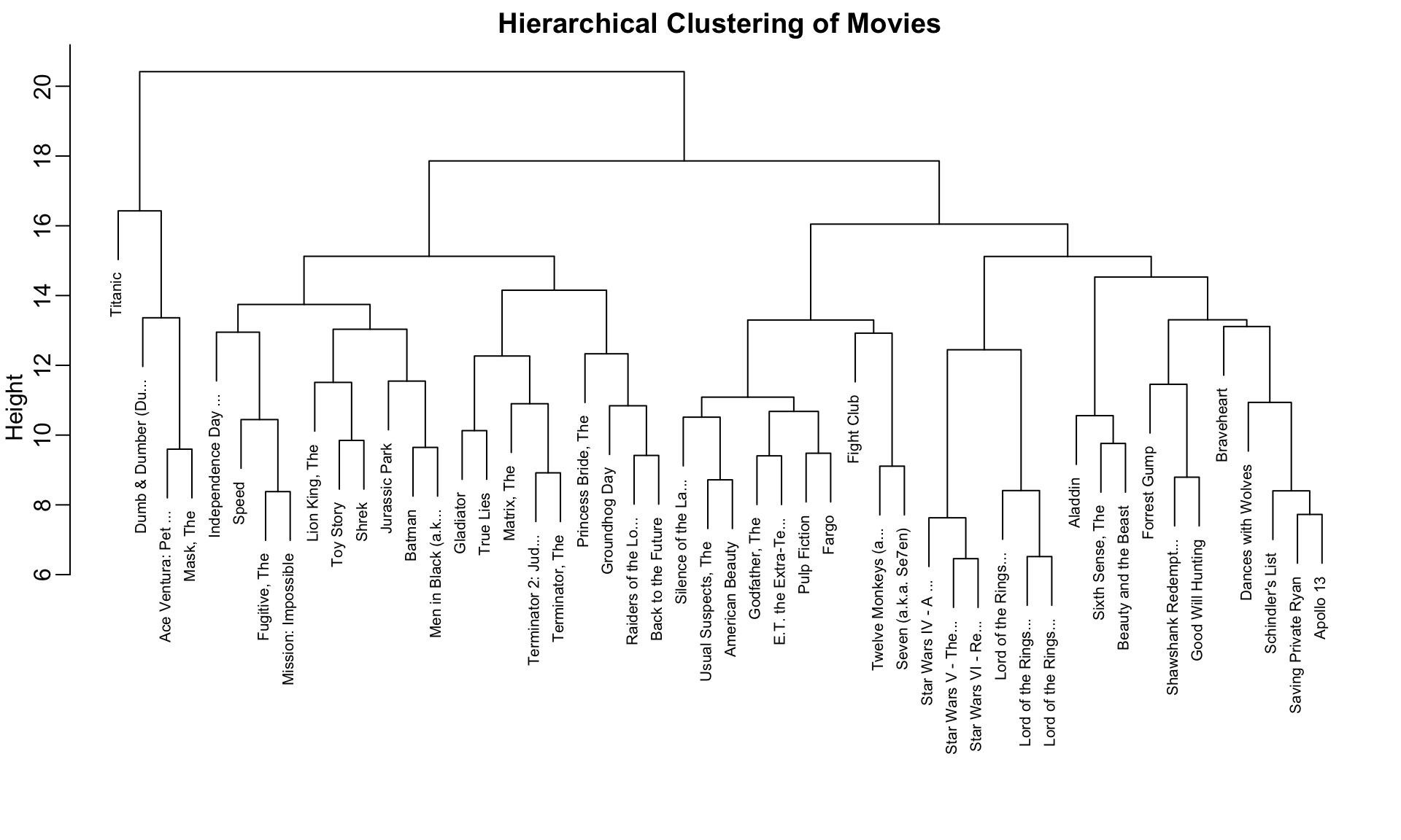 Figure 36.1: Hierarchical clustering dendrogram of movies. Height indicates distance at which clusters merge. Movies that split at lower heights are more similar.