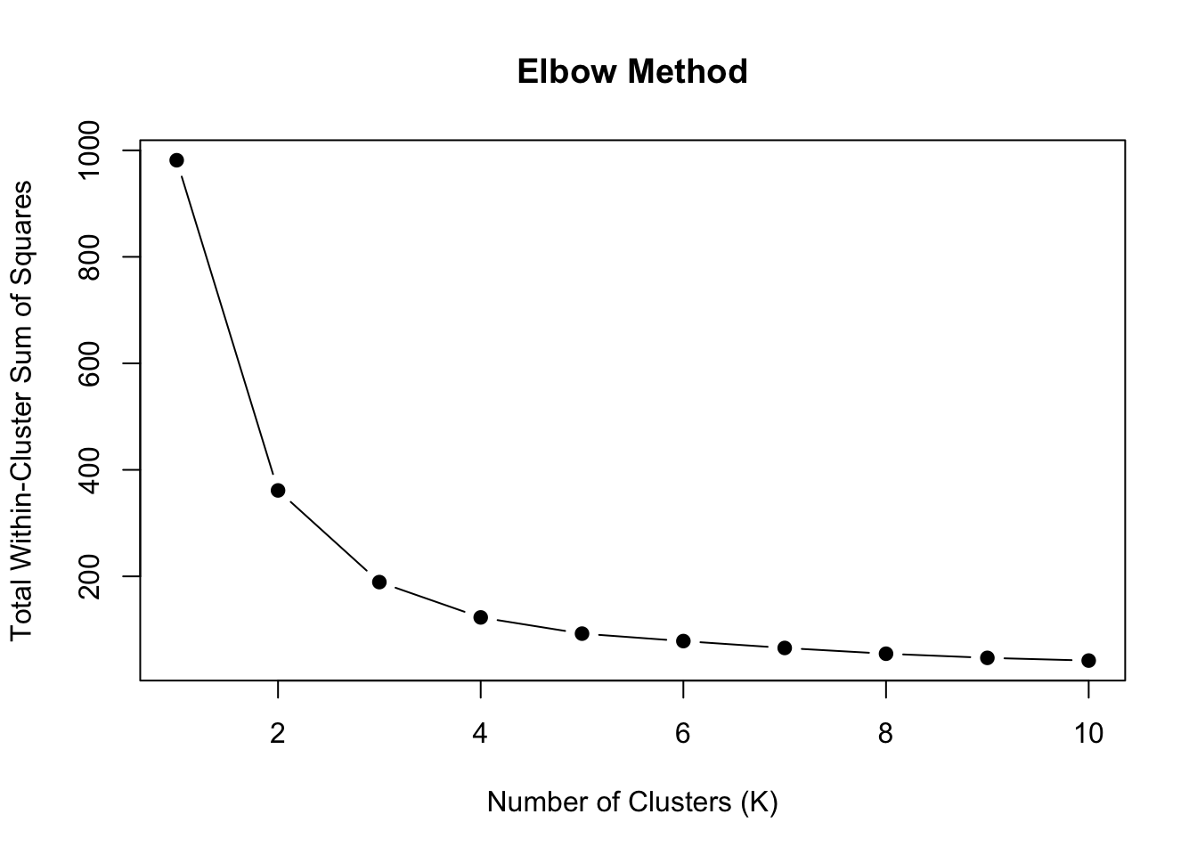 Plot within-cluster sum of squares against \(K\) and look for an “elbow” where the rate of decrease slows: