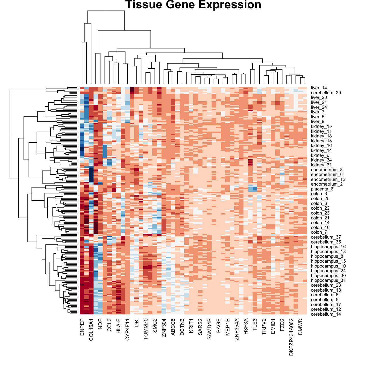 Figure 36.6: Heatmap of tissue gene expression data with hierarchical clustering on both rows and columns