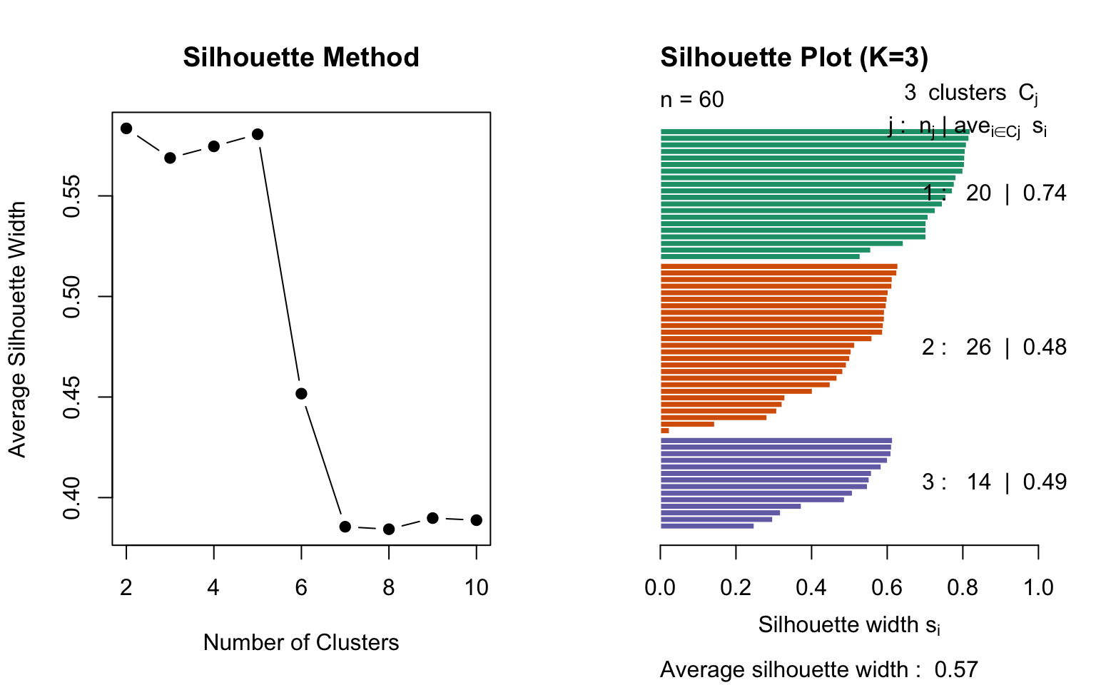 library(cluster)# Calculate silhouette scores for different Ksil_width <-sapply(2:10, function(k) { km <-kmeans(sample_data, centers = k, nstart =20) ss <-silhouette(km$cluster, dist(sample_data))mean(ss[, "sil_width"])})par(mfrow =c(1, 2))plot(2:10, sil_width, type ="b", pch =19,xlab ="Number of Clusters",ylab ="Average Silhouette Width",main ="Silhouette Method")# Detailed silhouette plot for K=3km_3 <-kmeans(sample_data, centers =3, nstart =20)sil_3 <-silhouette(km_3$cluster, dist(sample_data))plot(sil_3, col =1:3, main ="Silhouette Plot (K=3)")