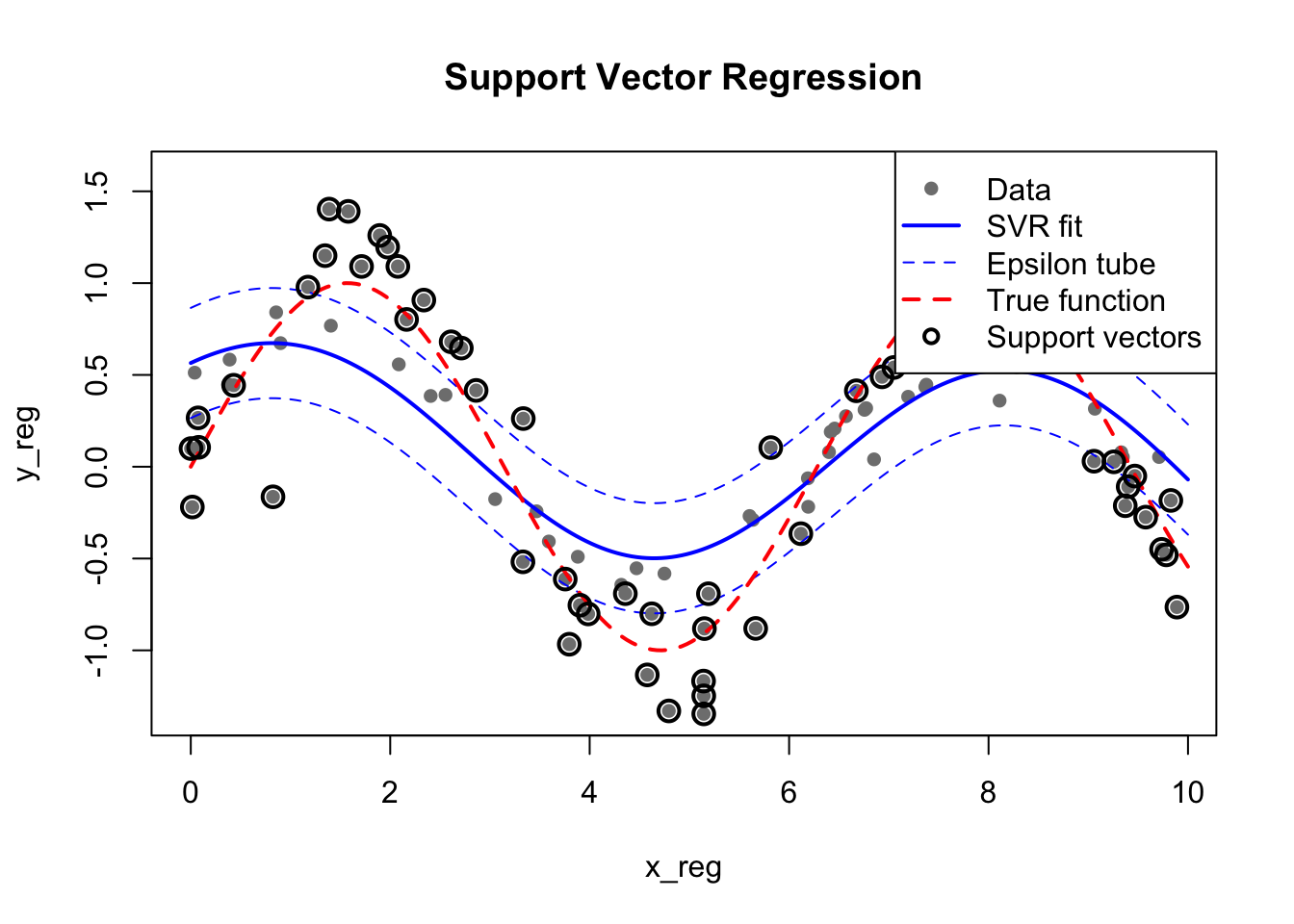 legend("topright", c("Data", "SVR fit", "Epsilon tube", "True function", "Support vectors"),