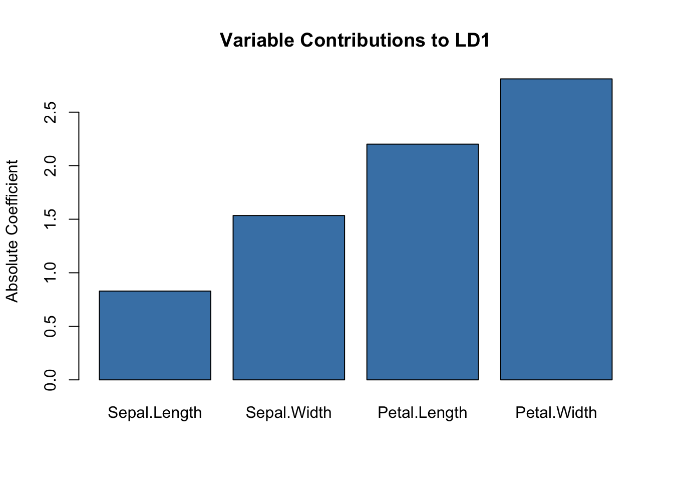 # Which variables contribute most to separation?scaling_df <-data.frame(Variable =rownames(lda_model$scaling),LD1 =abs(lda_model$scaling[, 1]),LD2 =abs(lda_model$scaling[, 2]))barplot(scaling_df$LD1, names.arg = scaling_df$Variable,main ="Variable Contributions to LD1",ylab ="Absolute Coefficient",col ="steelblue")