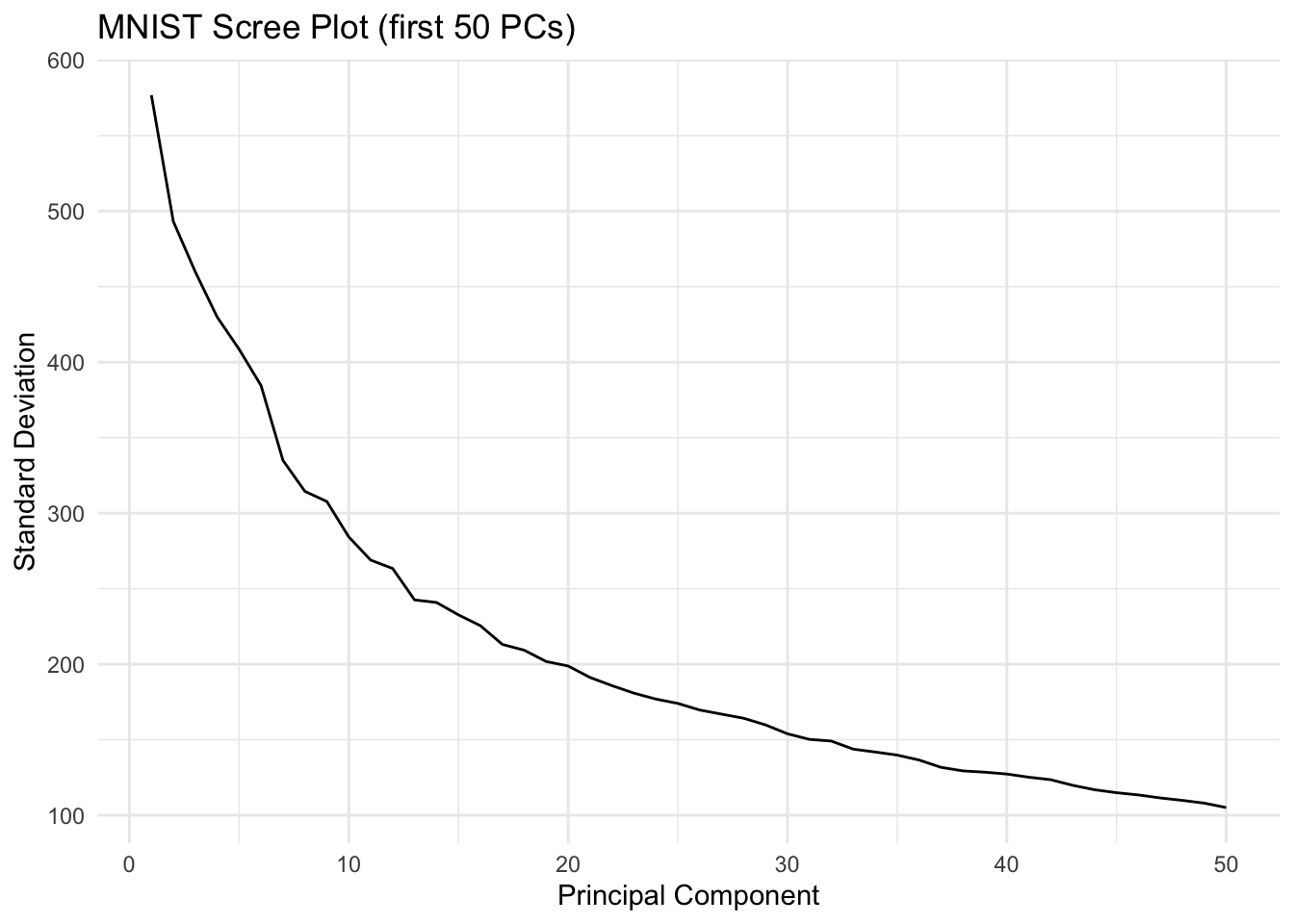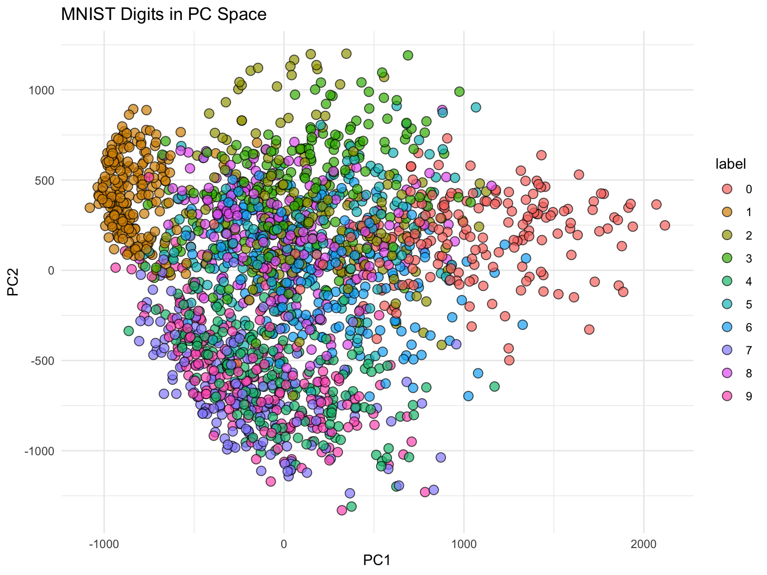 library(caret)k <-36x_train <- pca$x[, 1:k]y <-factor(mnist$train$labels)fit <-knn3(x_train, y)# Transform test set using training PCAx_test <-sweep(mnist$test$images, 2, col_means) %*% pca$rotationx_test <- x_test[, 1:k]# Predict and evaluatey_hat <-predict(fit, x_test, type ="class")confusionMatrix(y_hat, factor(mnist$test$labels))$overall["Accuracy"]