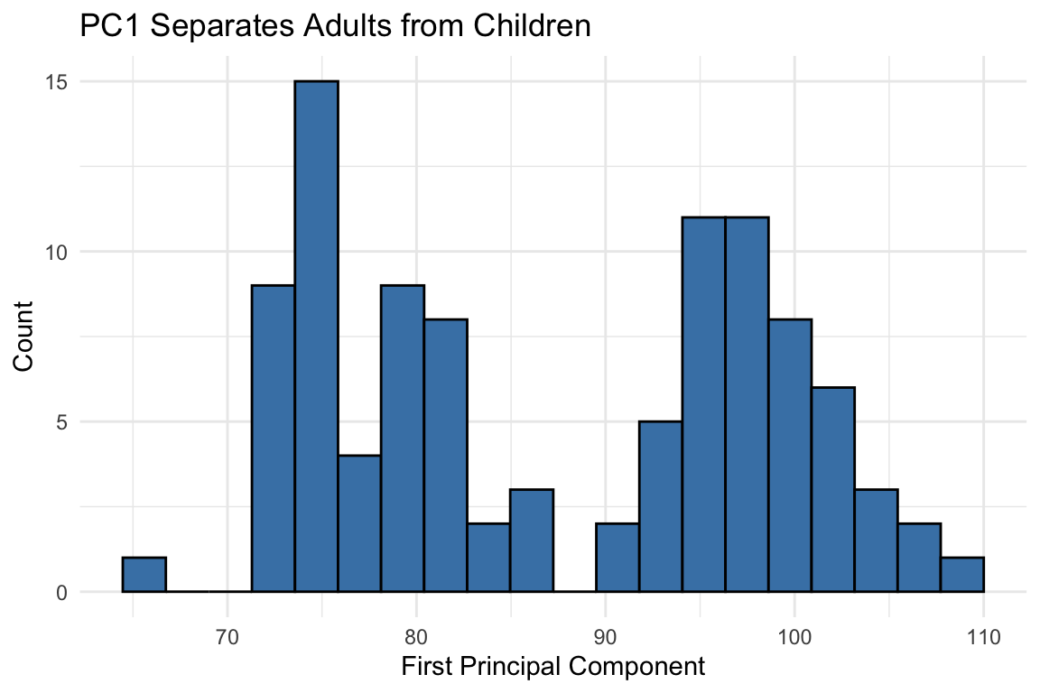 qplot(z[, 1], bins =20, color =I("black"), fill =I("steelblue")) +labs(x ="First Principal Component", y ="Count",title ="PC1 Separates Adults from Children")