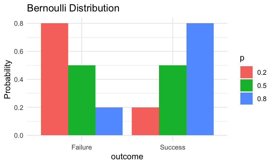 # Bernoulli with different p valuesp_vals <-c(0.2, 0.5, 0.8)data.frame(outcome =rep(c("Failure", "Success"), 3),p =rep(p_vals, each =2),prob =c(1-p_vals[1], p_vals[1], 1-p_vals[2], p_vals[2], 1-p_vals[3], p_vals[3])) %>%ggplot(aes(x = outcome, y = prob, fill =factor(p))) +geom_col(position ="dodge") +labs(title ="Bernoulli Distribution", y ="Probability", fill ="p")
