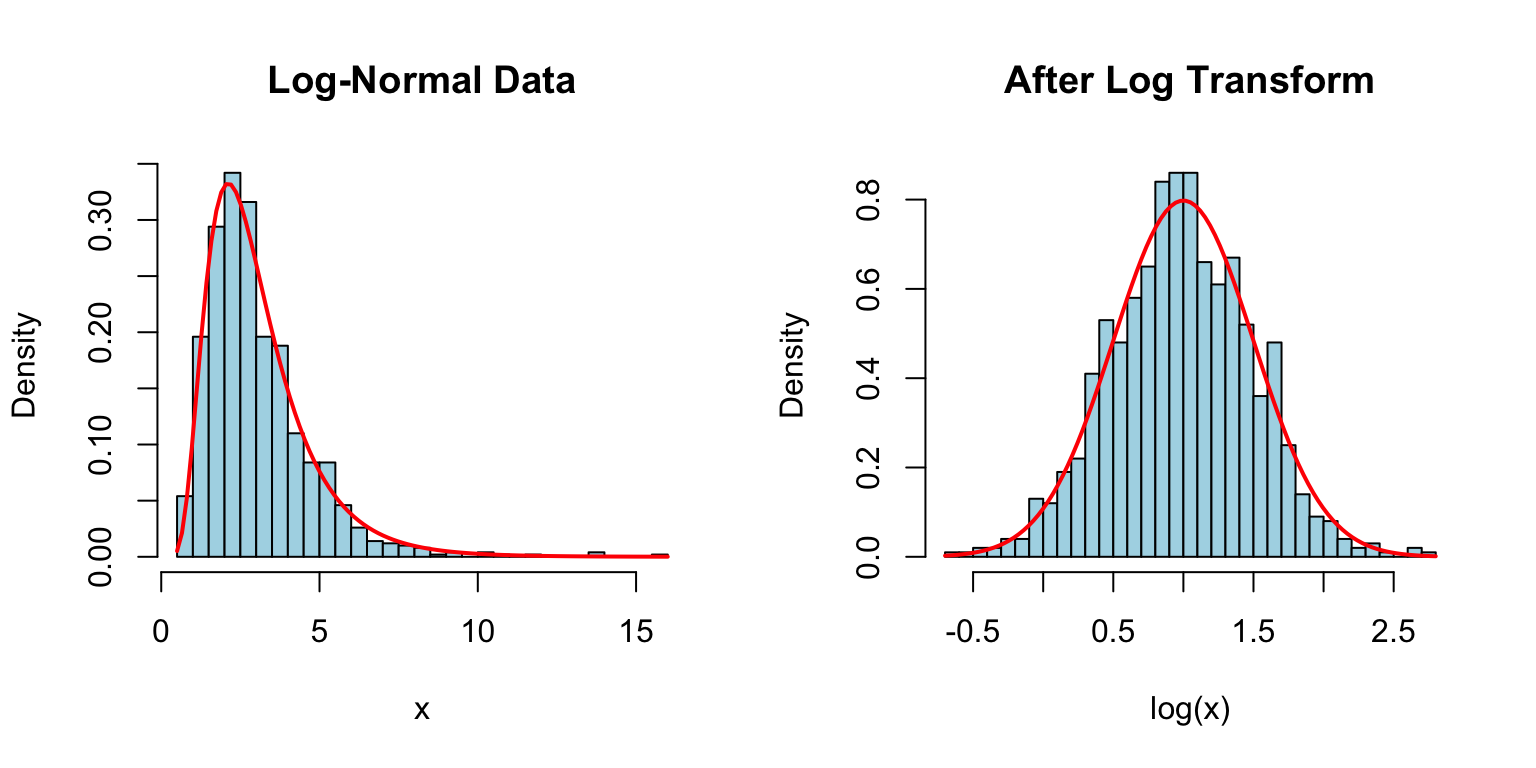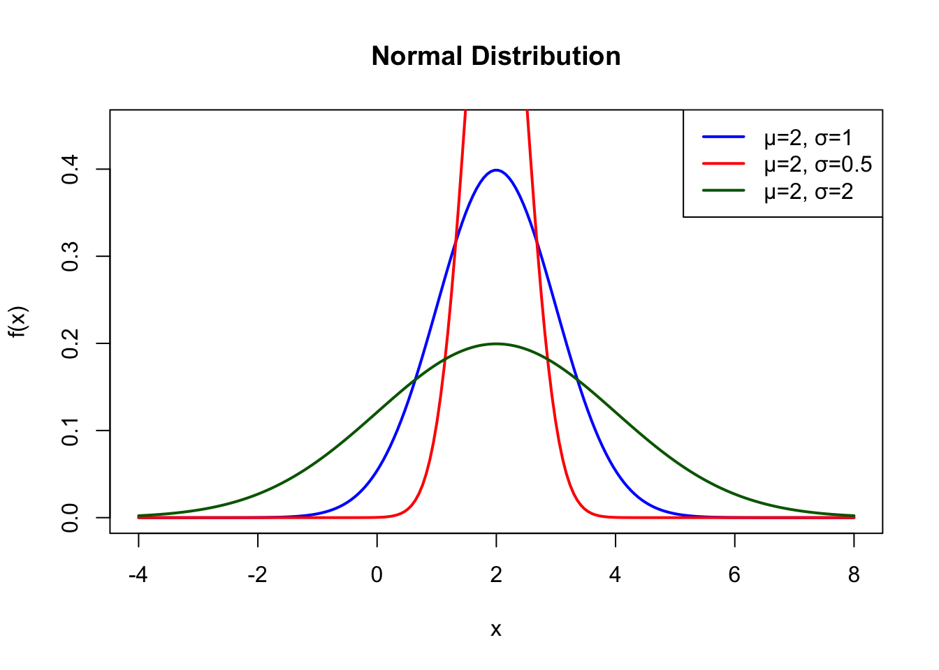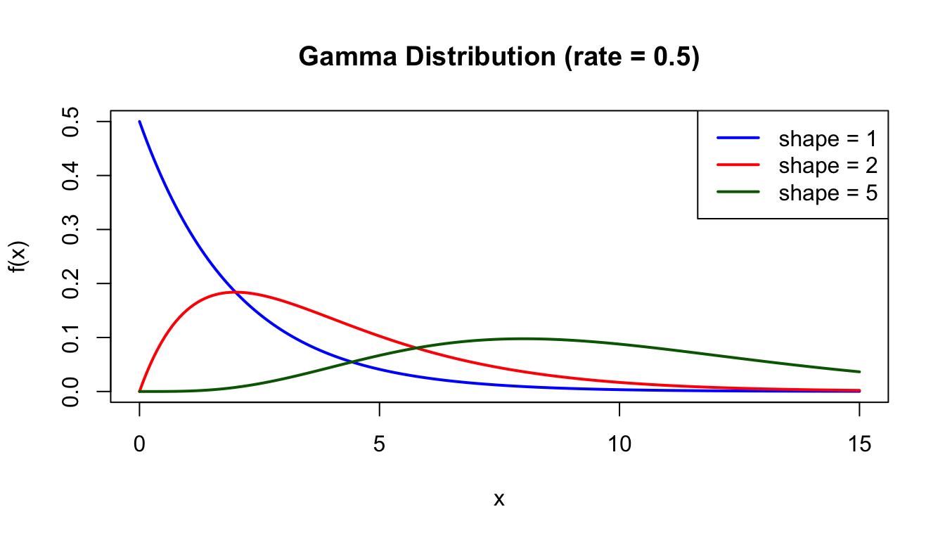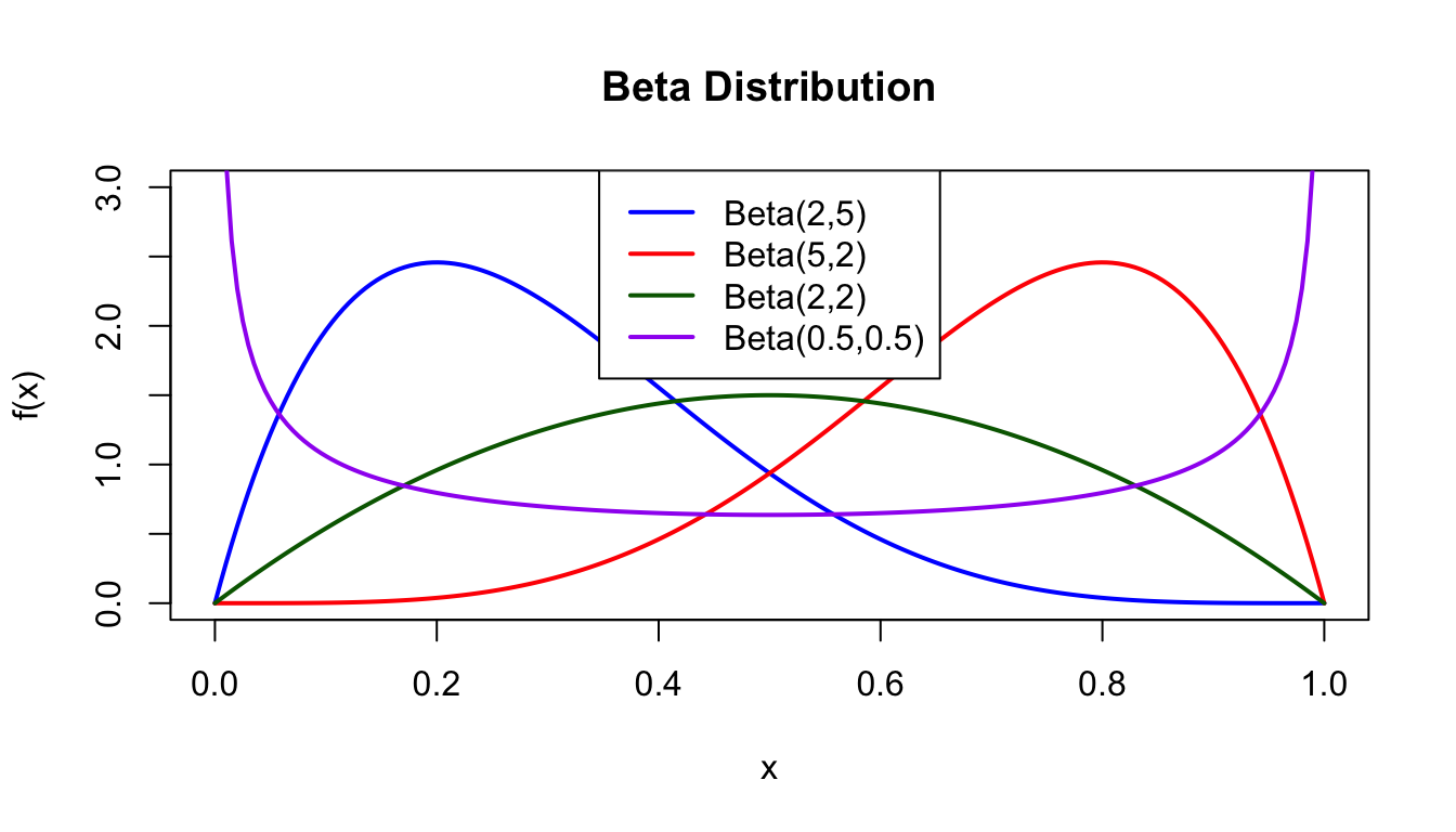 x <-seq(0, 1, length.out =200)plot(x, dbeta(x, 2, 5), type ="l", lwd =2, col ="blue",xlab ="x", ylab ="f(x)", main ="Beta Distribution",ylim =c(0, 3))lines(x, dbeta(x, 5, 2), lwd =2, col ="red")lines(x, dbeta(x, 2, 2), lwd =2, col ="darkgreen")lines(x, dbeta(x, 0.5, 0.5), lwd =2, col ="purple")legend("top", c("Beta(2,5)", "Beta(5,2)", "Beta(2,2)", "Beta(0.5,0.5)"),col =c("blue", "red", "darkgreen", "purple"), lwd =2)