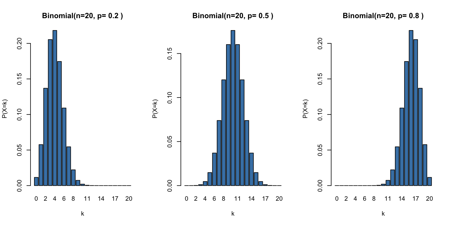 # Binomial distributions with n=20par(mfrow =c(1, 3))for (p inc(0.2, 0.5, 0.8)) { x <-0:20barplot(dbinom(x, 20, p), names.arg = x,main =paste("Binomial(n=20, p=", p, ")"),xlab ="k", ylab ="P(X=k)", col ="steelblue")}