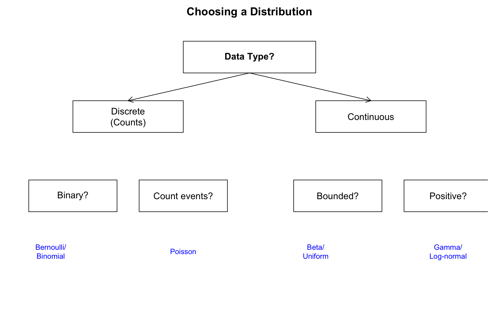 # Geometric distribution example# If extinction probability is 0.1 per year, expected time to extinction?p <-0.1x <-1:50plot(x, dgeom(x-1, p), type ="h", lwd =2, col ="steelblue",xlab ="Years until extinction", ylab ="Probability",main =paste("Geometric Distribution (p =", p, ")\nMean =", 1/p, "years"))