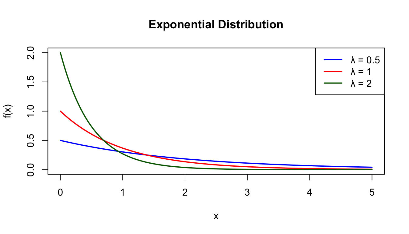 Probability density function:\[f(x) = \lambda e^{-\lambda x}, \quad x \geq 0\]