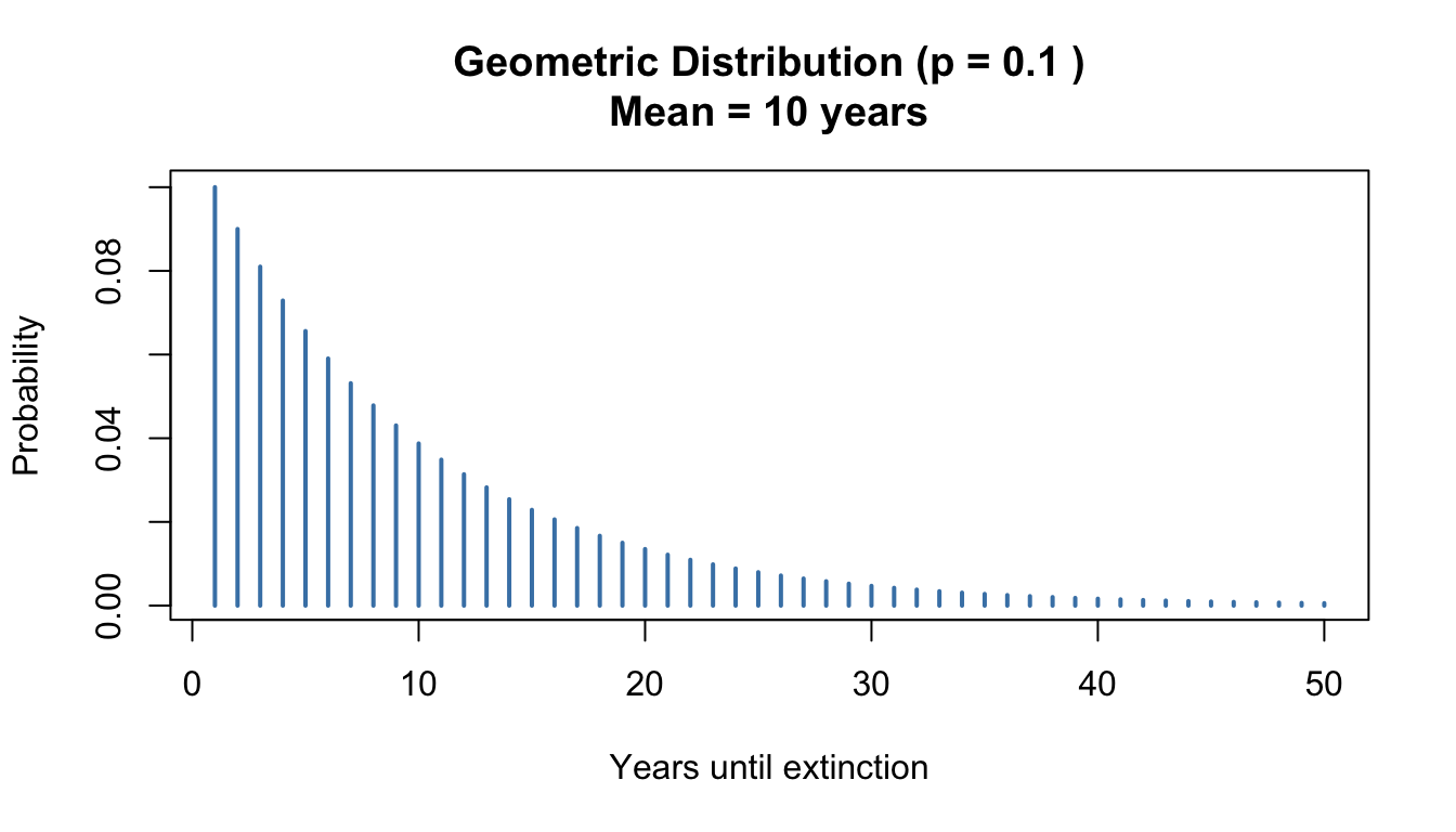 Figure 50.3: Geometric distribution showing the probability of years until extinction when p = 0.1