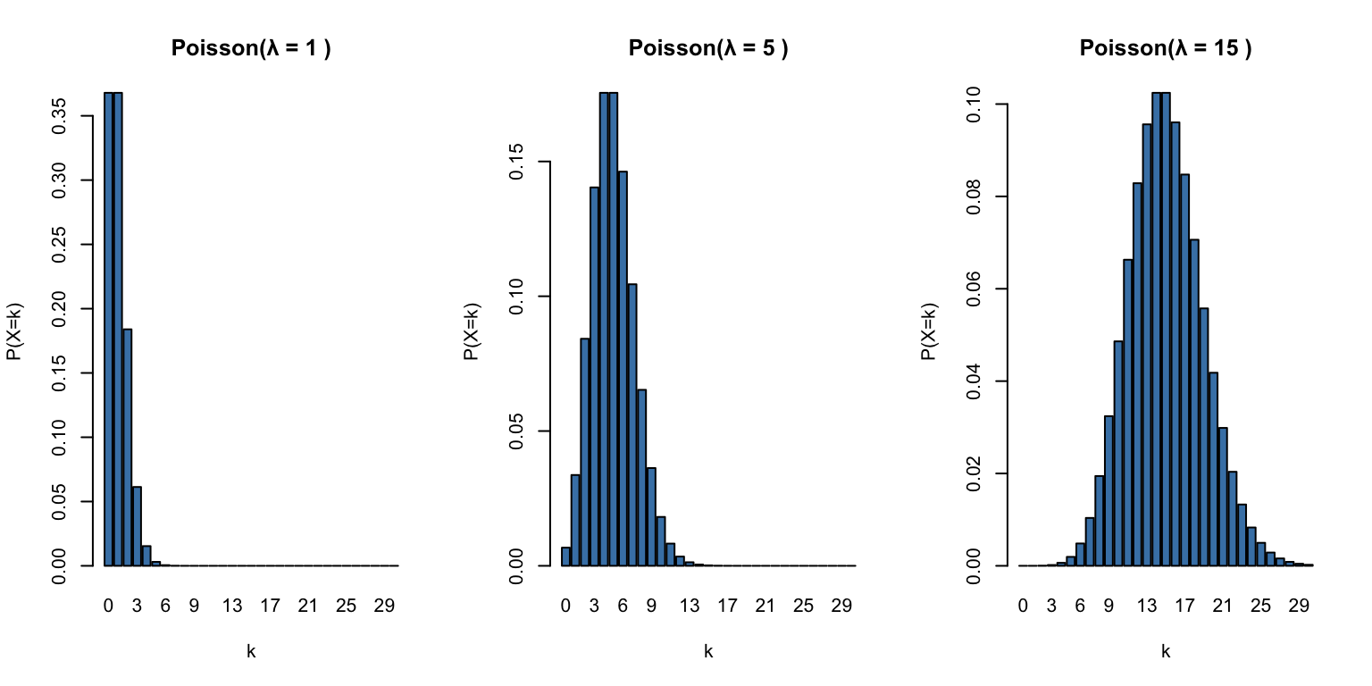 # Poisson distributions with different lambda valuespar(mfrow =c(1, 3))for (lambda inc(1, 5, 15)) { x <-0:30barplot(dpois(x, lambda), names.arg = x,main =paste("Poisson(λ =", lambda, ")"),xlab ="k", ylab ="P(X=k)", col ="steelblue")}