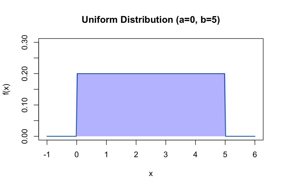 x <-seq(-1, 6, length.out =200)plot(x, dunif(x, min =0, max =5), type ="l", lwd =2, col ="steelblue",xlab ="x", ylab ="f(x)", main ="Uniform Distribution (a=0, b=5)",ylim =c(0, 0.3))polygon(c(0, 0, 5, 5), c(0, 0.2, 0.2, 0), col =rgb(0, 0, 1, 0.3), border =NA)