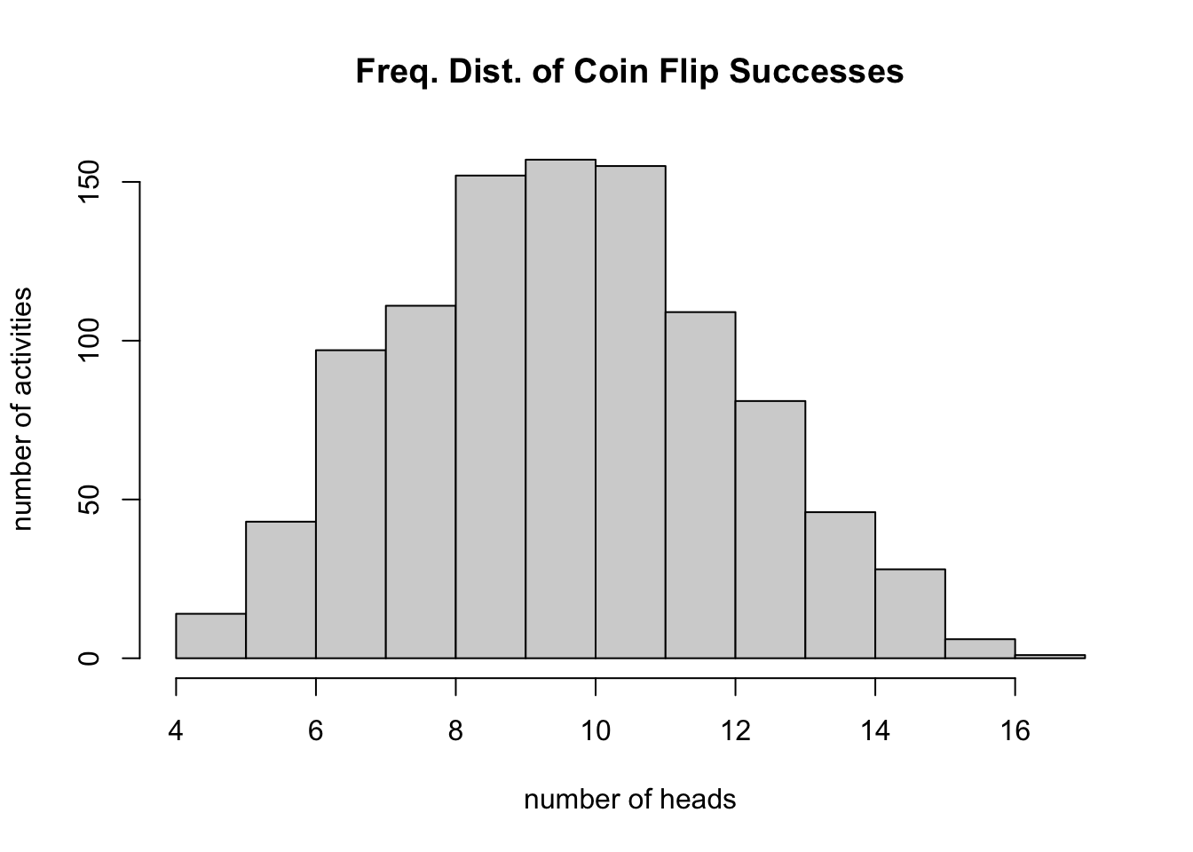 hist(rbinom(n=1000, size=20, prob=0.5), xlab="number of heads", ylab="number of activities",