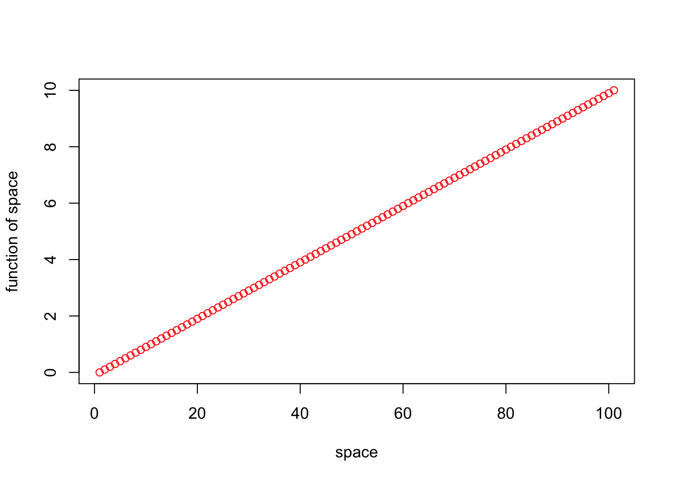 plot(seq_1, xlab="space", ylab ="function of space", type = "p", col = "red")