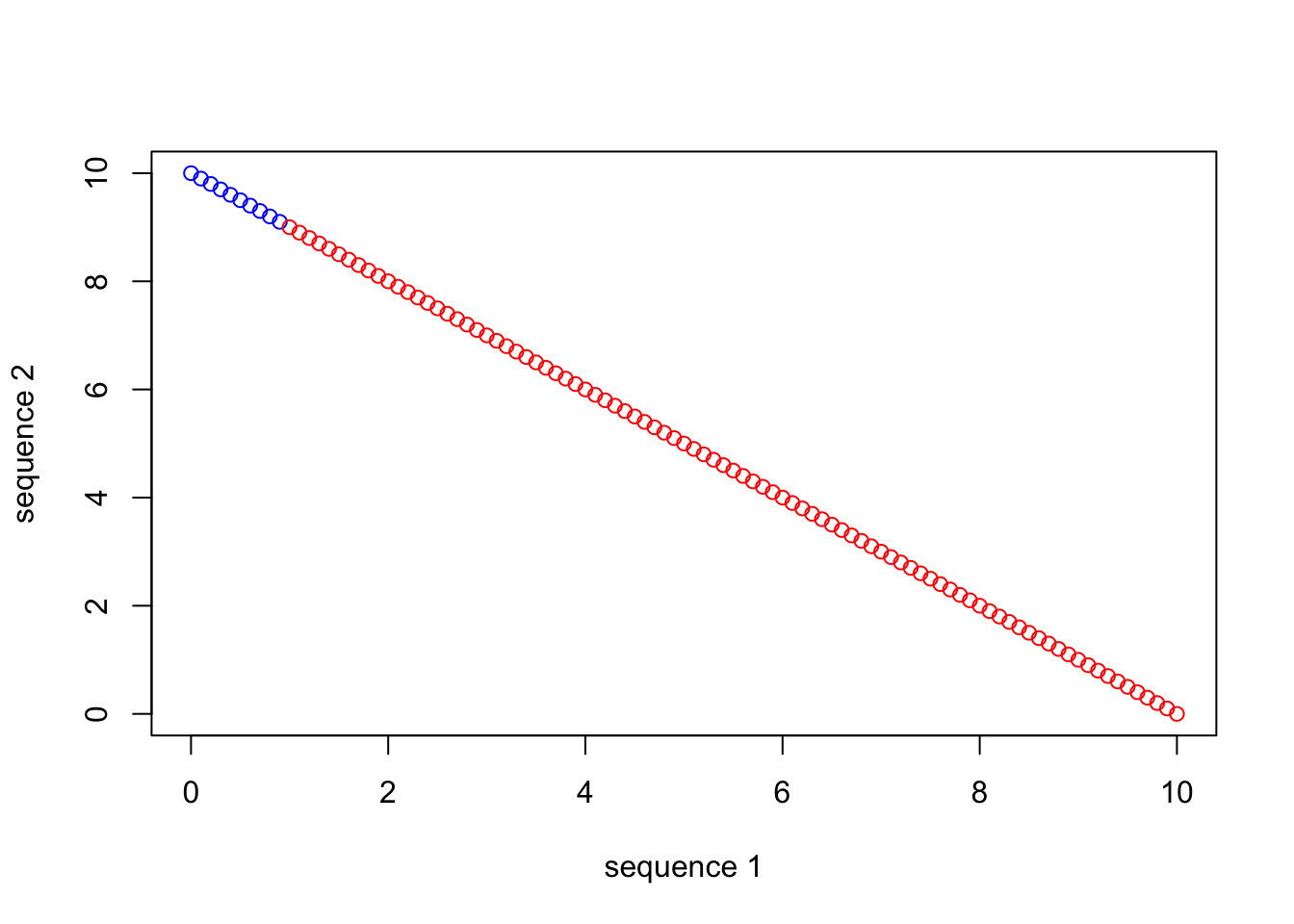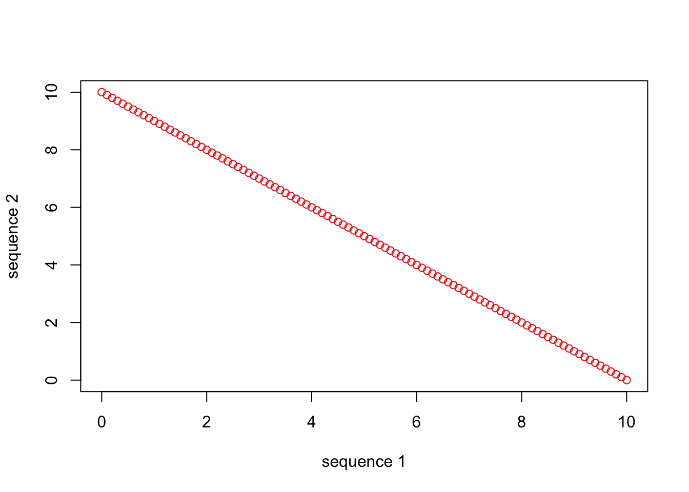 We only supplied the one vector (seq_1) to plot() in this case, which resulted in the function just defining the x-axis values as the numeric positions (1 to 101) of seq_1. Also, this style of plot is known as a “scatterplot.” There is usually more “scatter,” for example when plotting two variables that not perfectly related. With plot(), we usually want to examine the relationship between two different variables, like below: