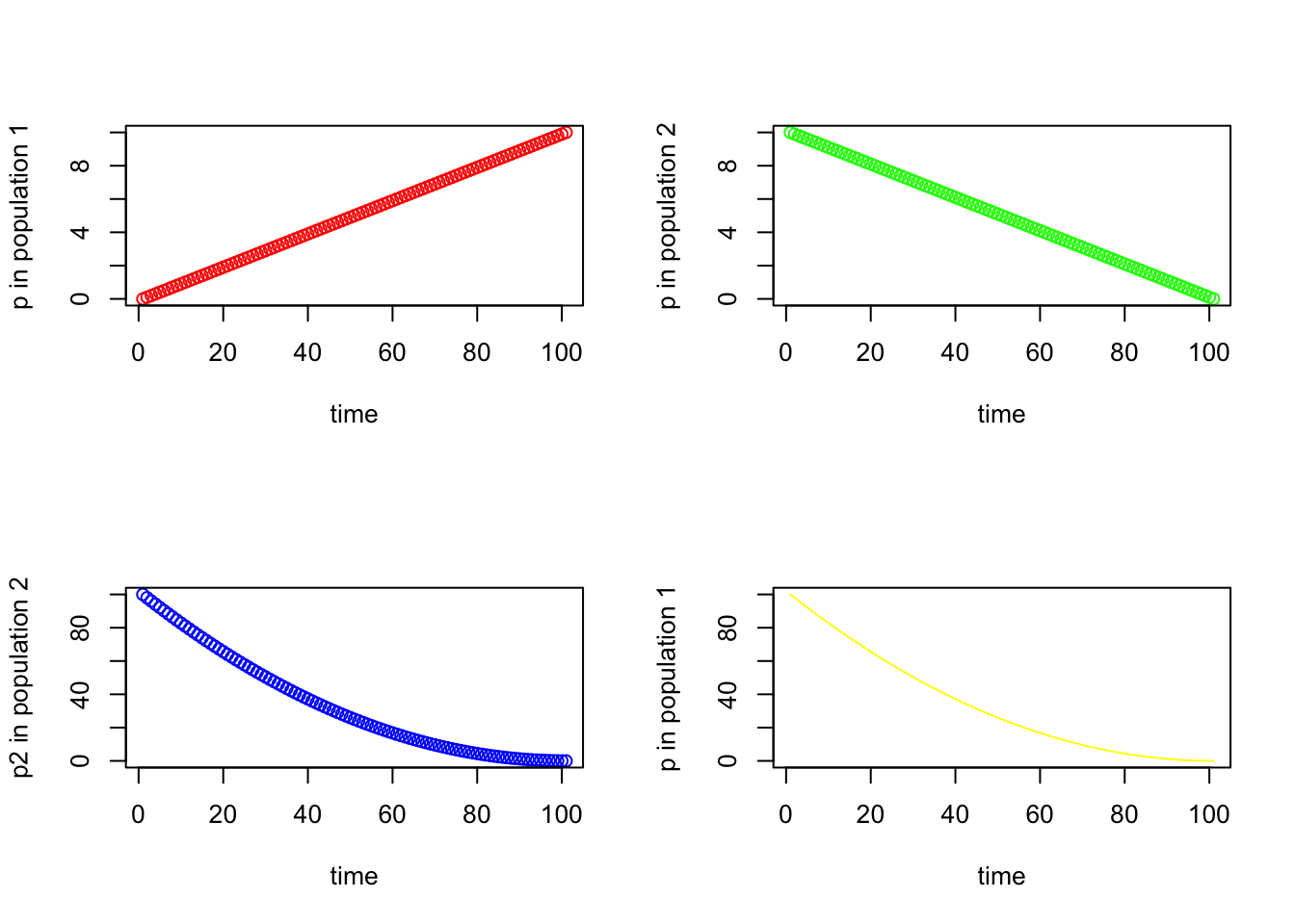 plot (seq_square_new, xlab="time", ylab ="p in population 1", type = "l", col = 'yellow')