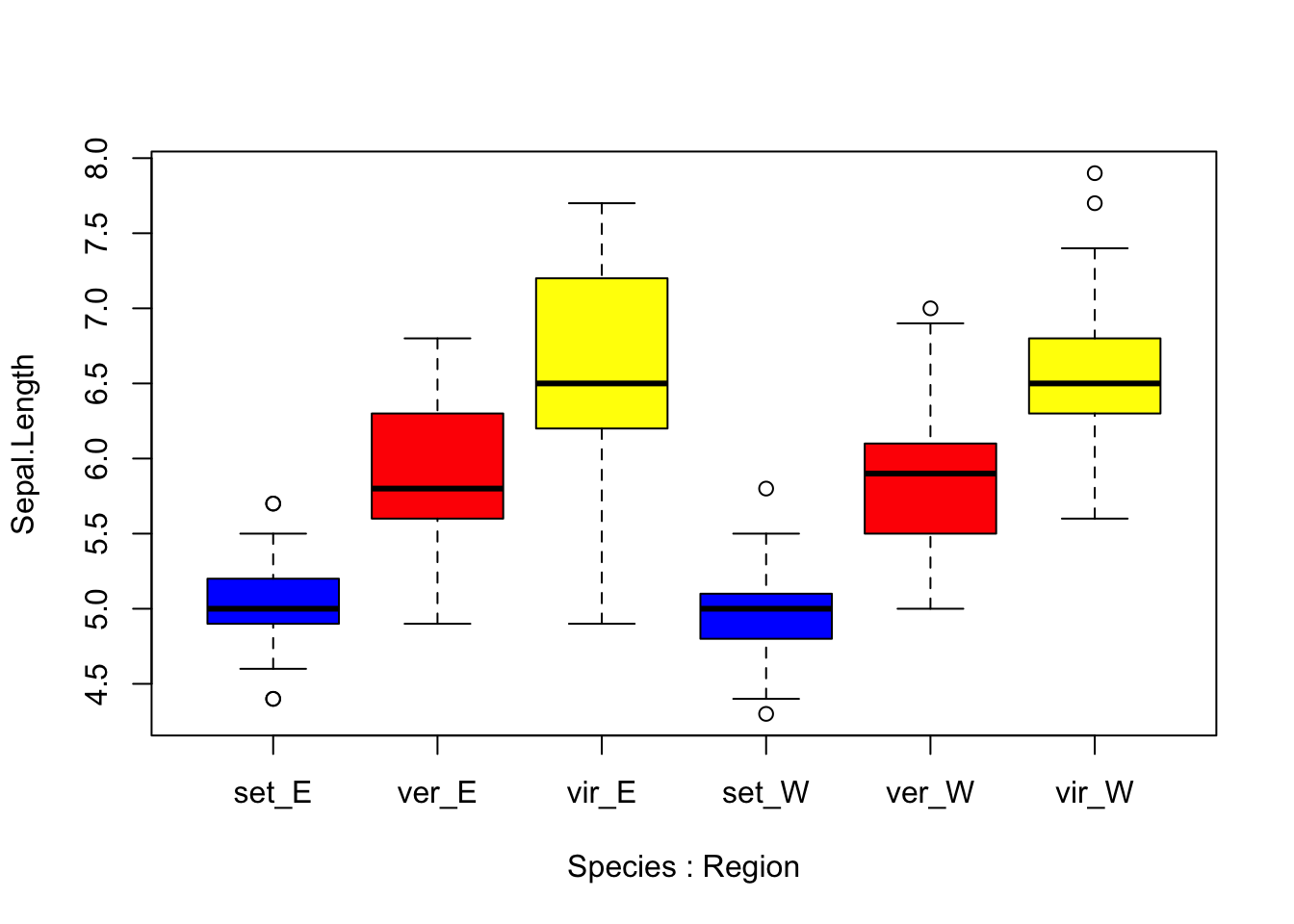 boxplot(Sepal.Length ~ Species*Region, col=c("blue", "red", "yellow", "blue", "red", "yellow"),